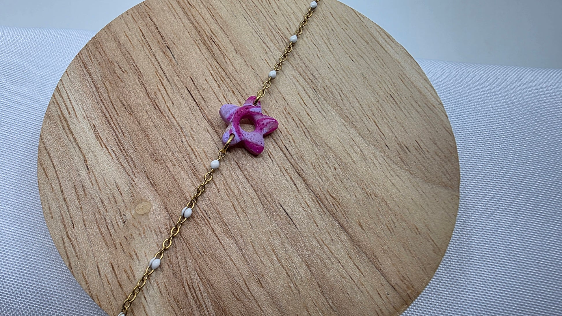 - Design Mignon : Fine chaîne ornée d'une breloque centrale en forme de fleur/étoile rose et mauve à effet marbré.