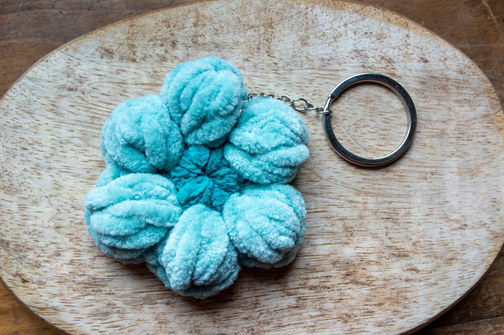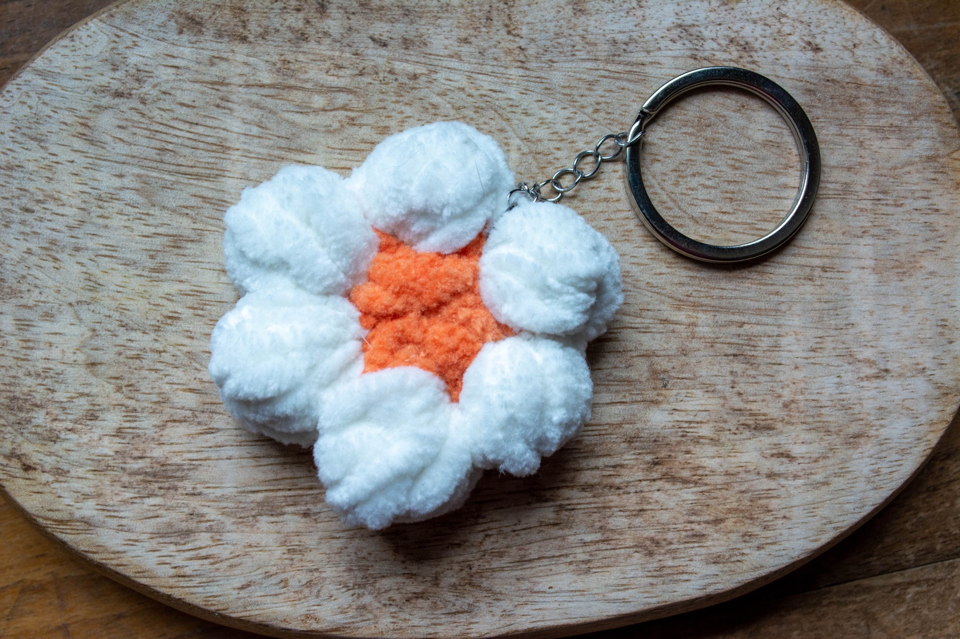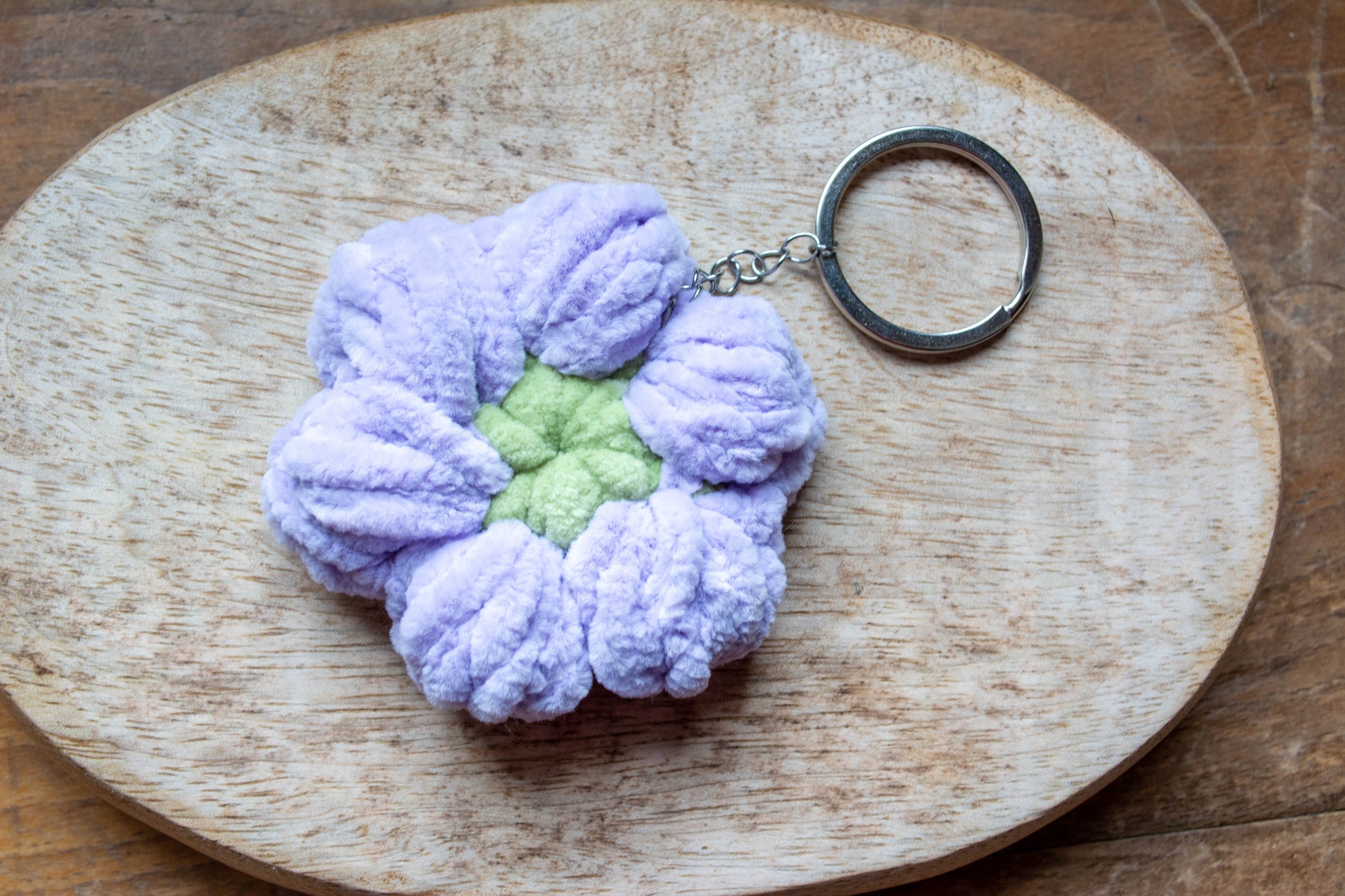 Porte-clés Fleurs avec base en acier inoxydable, fait au crochet.
